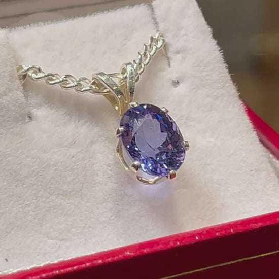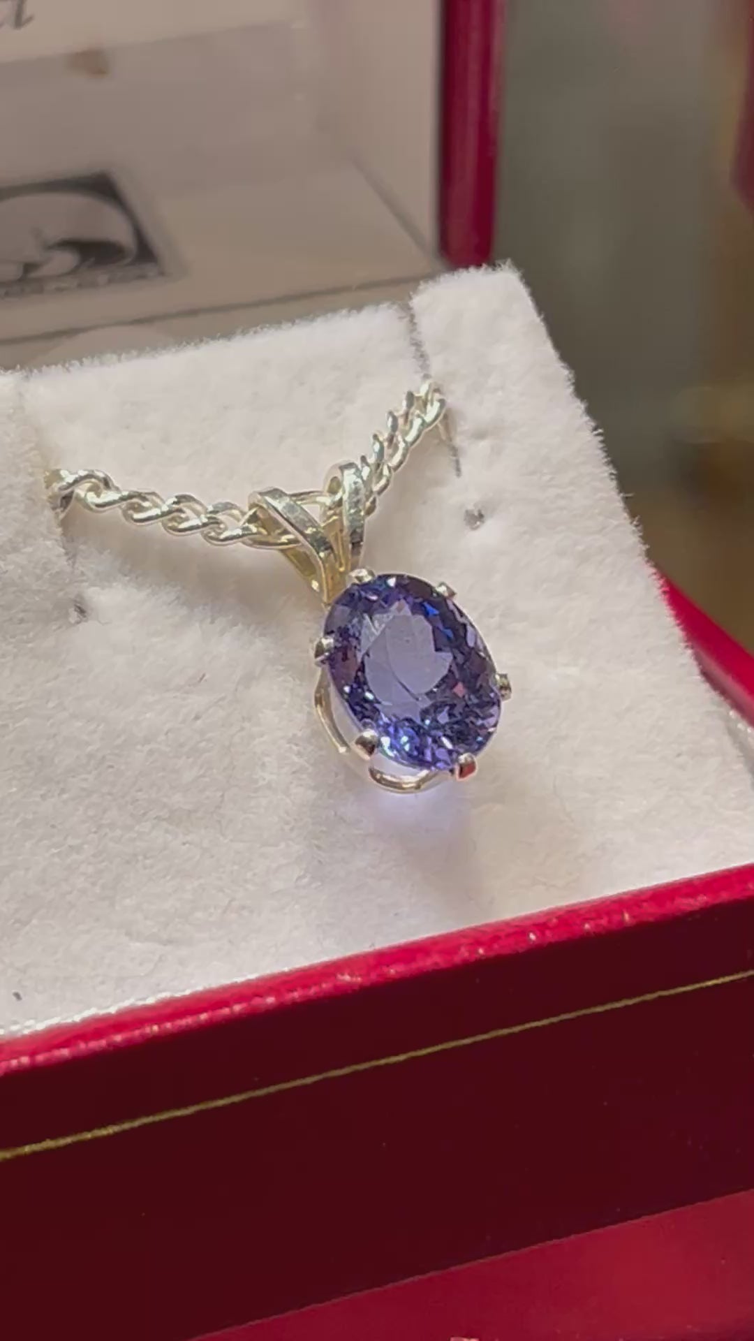 Brilliant 2.49 carat oval Tanzanite pendant in sterling silver on chain. This rare gemstone is a birthstone of December, and is a traditional 24th anniversary gift. This unique piece of jewelry is authentic Alaska Native art created by an enrolled member of an Alaska Native tribe. Certified Silver Hand and Made in Alaska jewelry.
