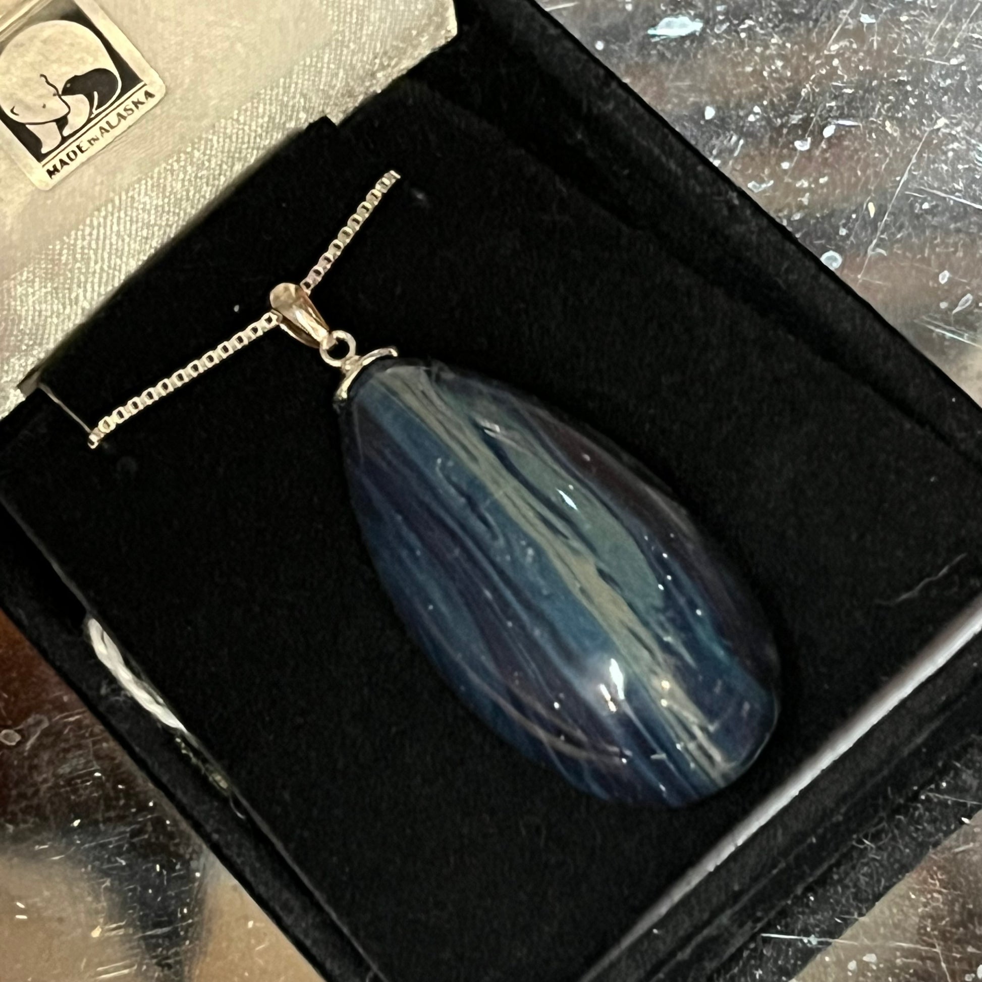 Teardrop blue copper slag pendant in silver. This unique piece of jewelry is authentic Alaska Native art created by an enrolled member of an Alaska Native tribe. Stone origin: Germany