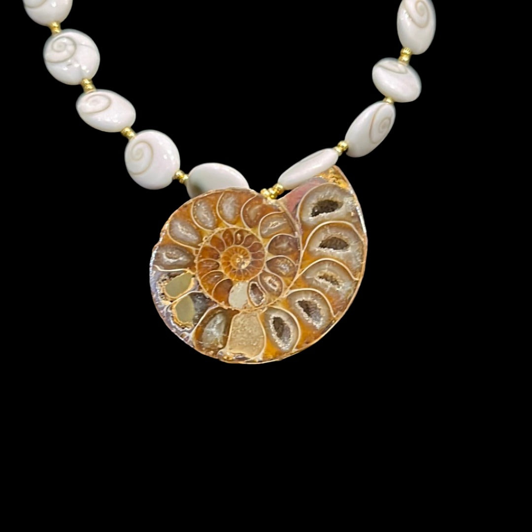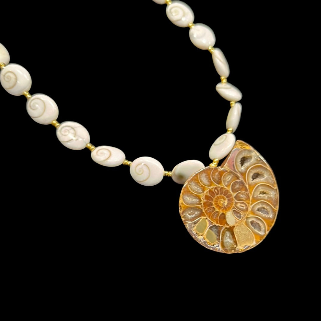 23in necklace with 24k gold spacer beads, polished operculum (snail trap doors), and showcasing an opalized Alaskan ammonite.