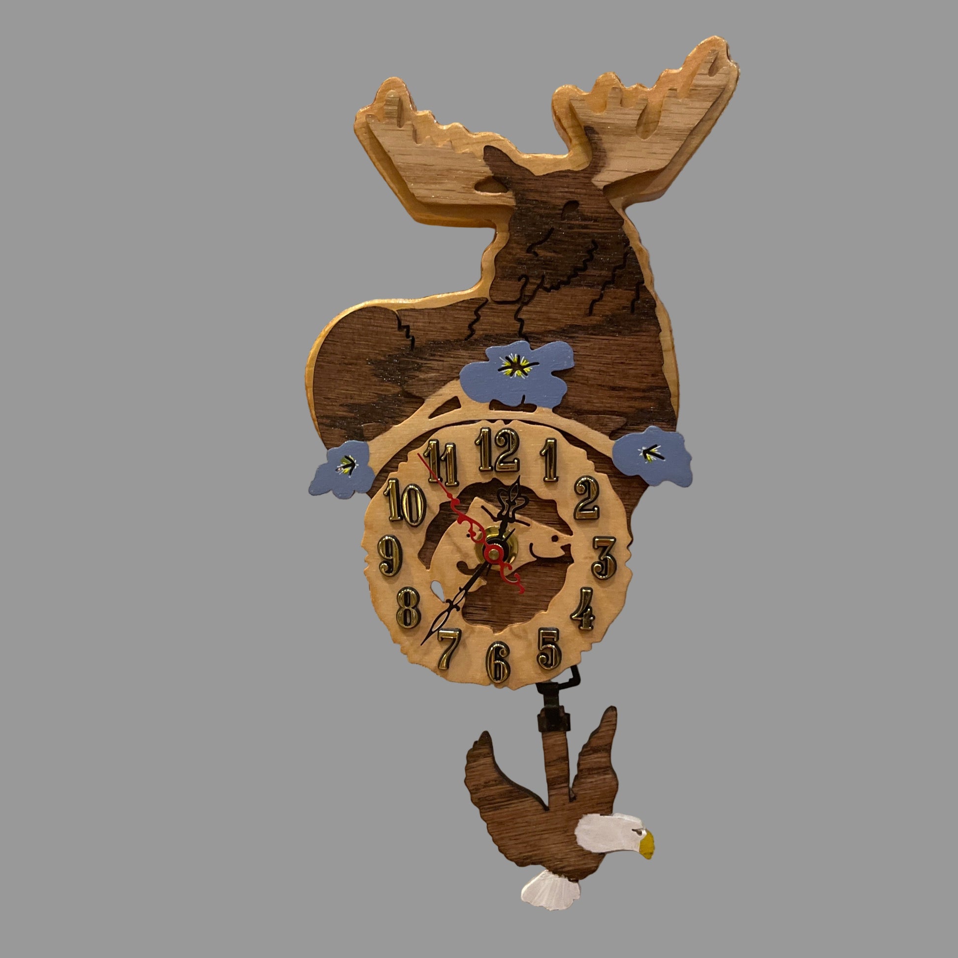 Wooden moose pendulum clock, hand scroll sawed, with high quality quartz movements, designed for years of service. One AA battery included. Certified Made in Alaska.
